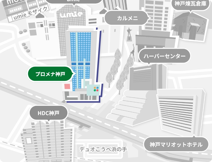 ハーバーランド入口にある「プロメナ神戸」ファッション・雑貨・サービス店などさまざまなニーズにお答えします。また地下1階のフードコートではいろんな食をお楽しみいただけます。都市の温浴施設万葉倶楽部でも、一日中ゆったりとおすごしいただけます。是非一度足を向けてください。