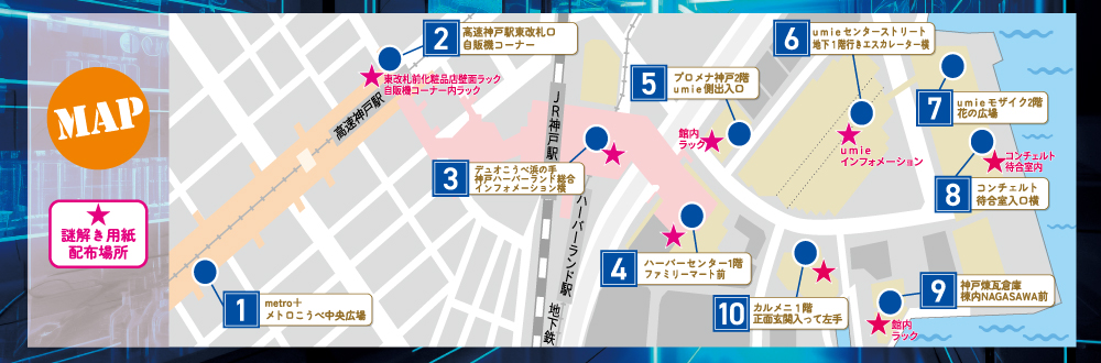 【高速神戸駅東改札前化粧品店壁面ラック/東改札ファミリーマート横自販機コーナー内ラック/デュオこうべ内ハーバーランド総合インフォメーション/ハーバーセンター1階/プロメナ神戸の館内ラック/umieインフォメーション/コンチェルト待合室/神戸煉瓦倉庫の棟内ラック/カルメニ1階】