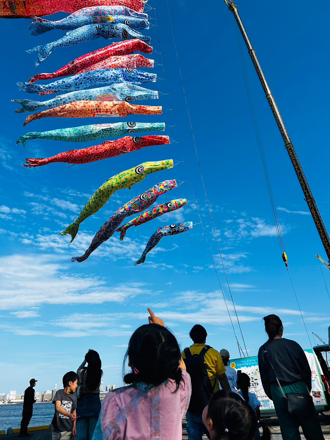 大型クレーンが全世界の子ども達が協力して作った小さなさかな達が集まった大きなこいのぼり約30琉を大空に掲げる掲揚アートイベント。