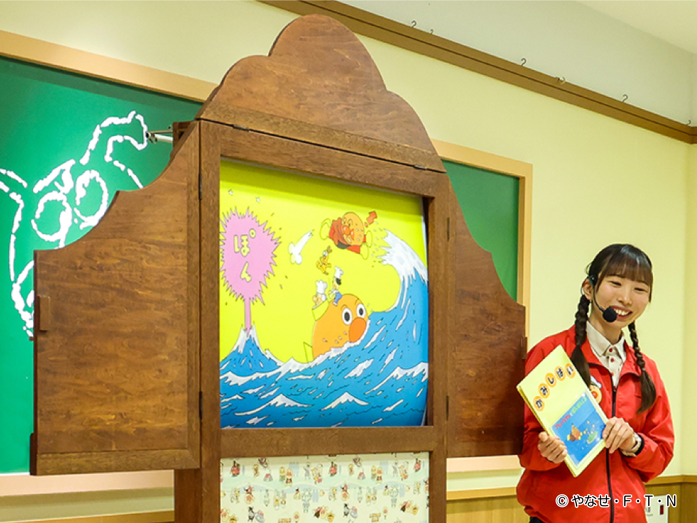 大きなパネルの上で、アンパンマンたちのお話が始まるよ。 みんなも大きな声を…