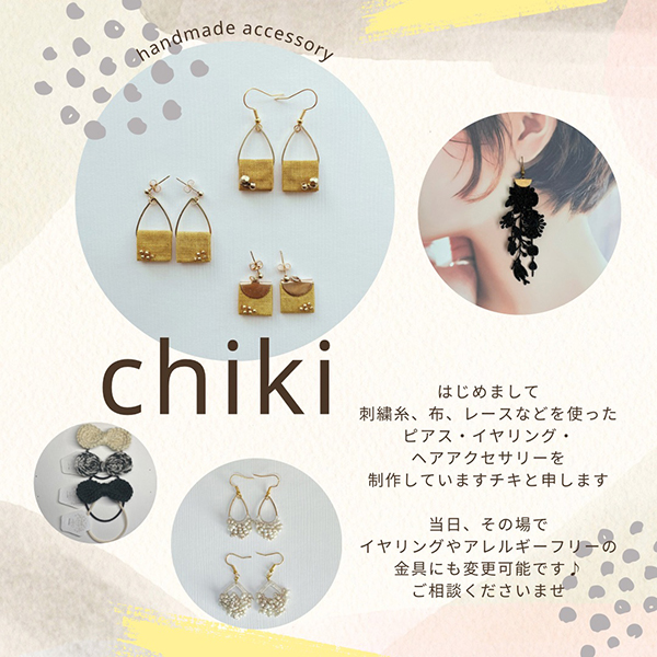 刺繍糸、布、レースなどを使ったピアス、イヤリング、ヘアアクセサリーなどを制作していますチキと申します。