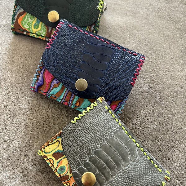 エイ、サメ、アザラシ、ゾウ、、カバ、オーストレッグ、印伝、スキモレザーなど多種多色の革と45色の糸を組み合わせ全て手作業で制作した触り心地まで一点モノの革細工