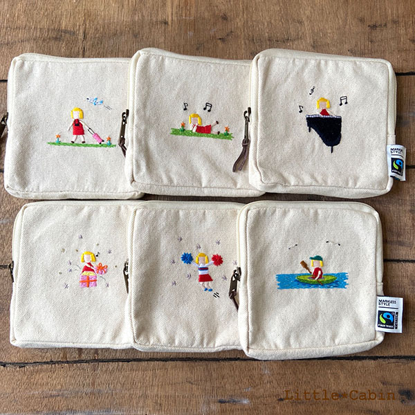 - 下書きはせず糸で絵を描くように看板娘のリルちゃんや大阪のおばちゃんトミ子の、可愛くクスッと笑える日常のワンシーンを刺しゅうしています。