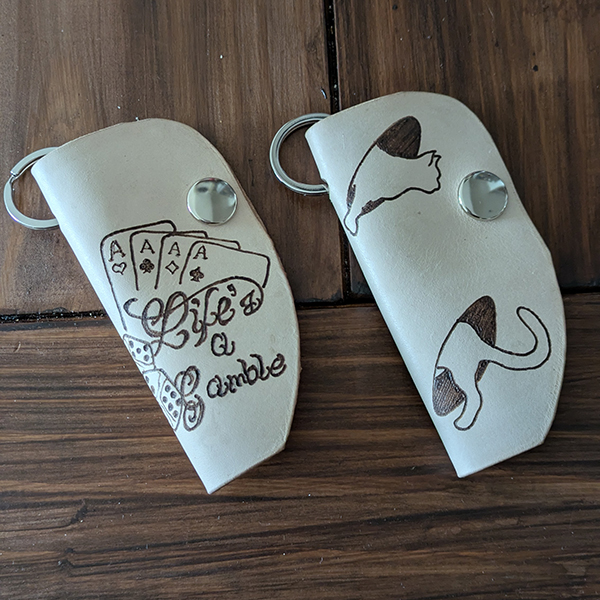 クラフト電気ペンを使用し、牛ヌメ革にレザーバーニングという技法で手描きで一点一点、絵柄などを描いてます。