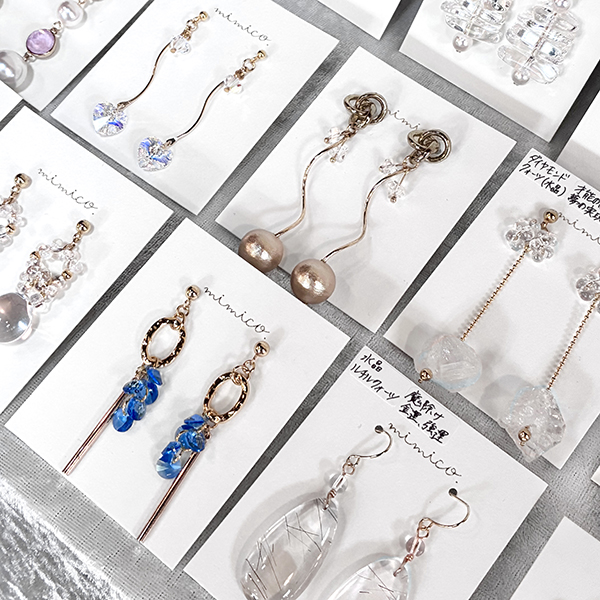 クリスタルガラスや天然石を組み合わせ、K18gpやサージカルステンレスなどアレルギーに配慮した素材を使用しています。